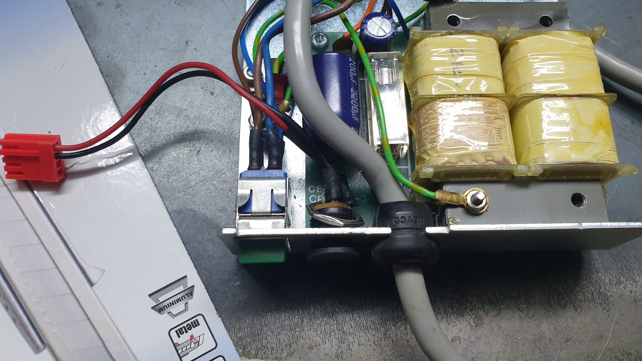 Nie do końca wierzyłem w stare kondensatory, wolałem mieć +5V z nowoczesnego zasilacza zewnętrznego, dlatego usunąłem stary przewód i zastąpiłem go gnizdem 5.5/2.1mm.